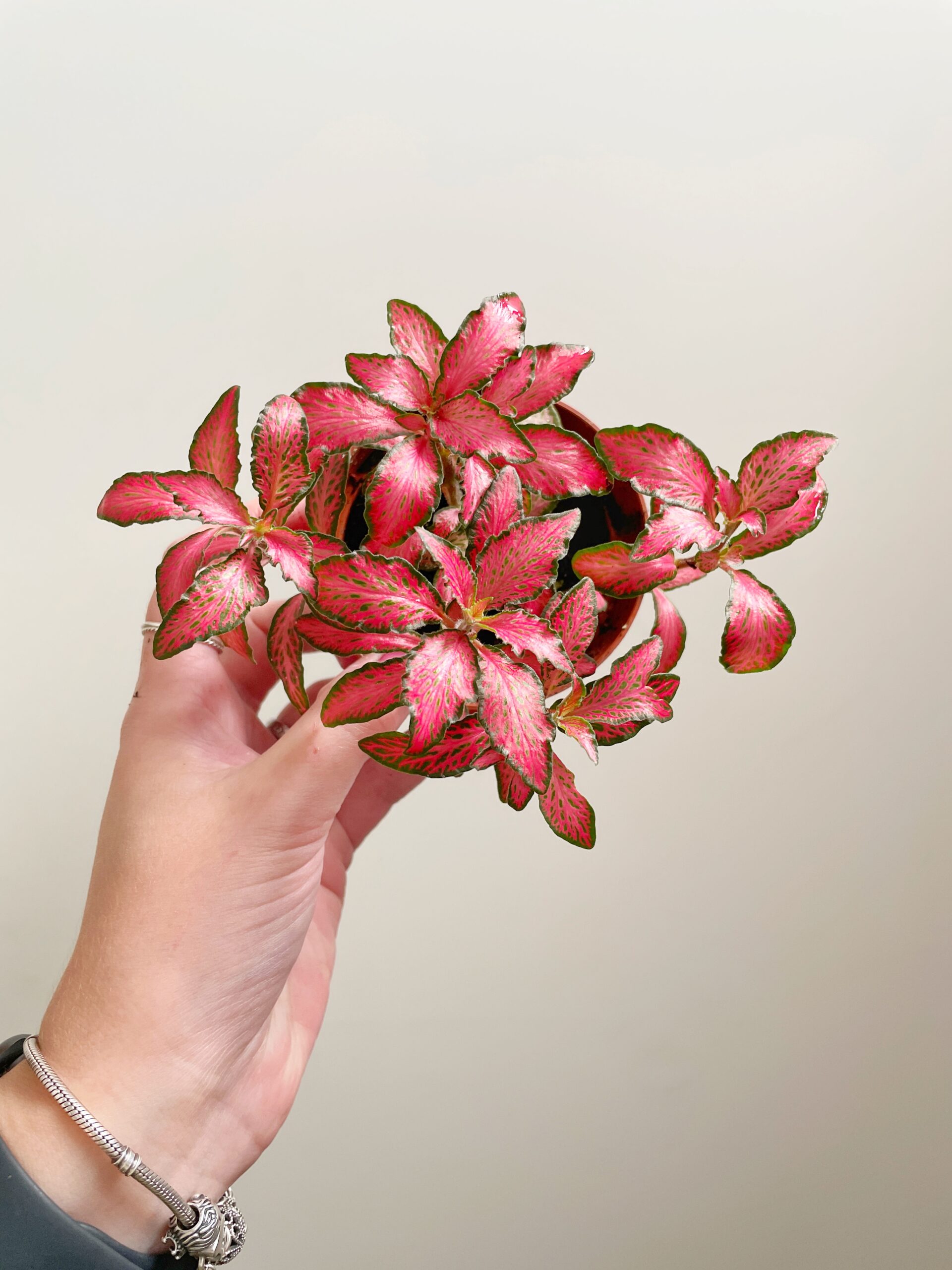 Een geworteld mini plantje van de Fittonia Forest Flame. De stek is goed geworteld en wordt zonder potje geleverd.